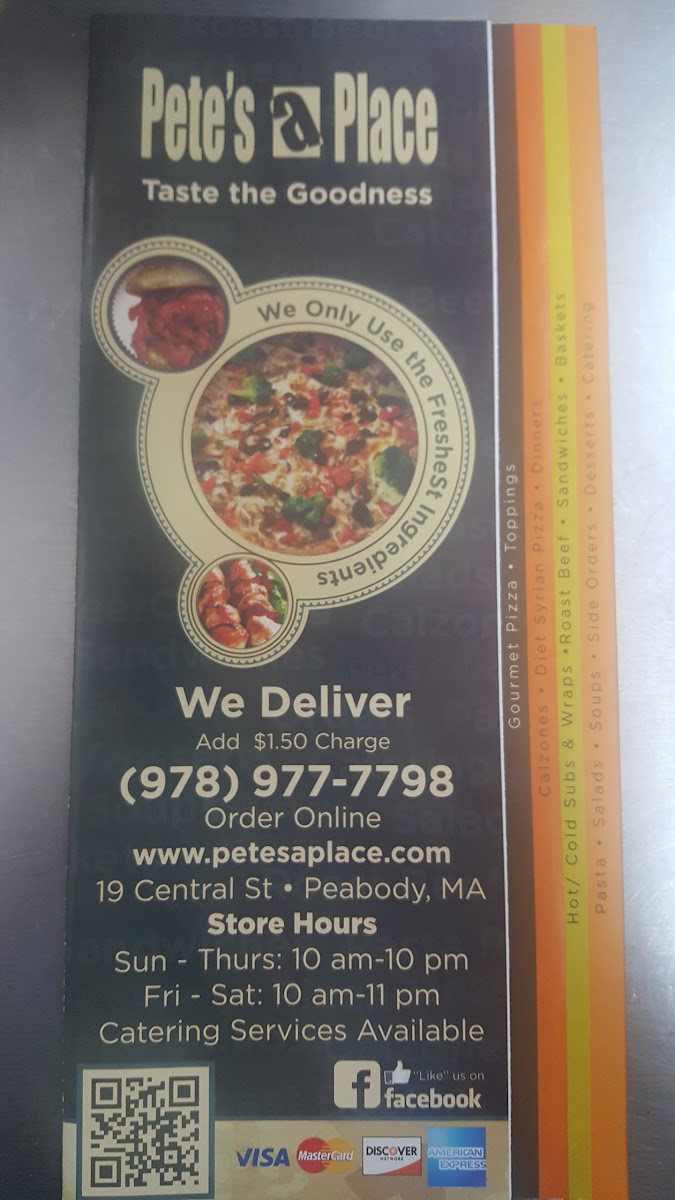 Introducing the menu at Pete's A Place - Peabody, a hidden gem located at 19 Central St, Peabody, MA. This delightful eatery offers an extensive selection of homemade pasta dishes that are sure to satiate any craving. Each dish celebrates authentic flavors, from the savory Chicken Parm to the rich Shrimp Broccoli Alfredo, priced between $13.49 and $19.49. Catering options are equally impressive, featuring generous trays of chicken fingers and mozzarella sticks ideal for any gathering.
